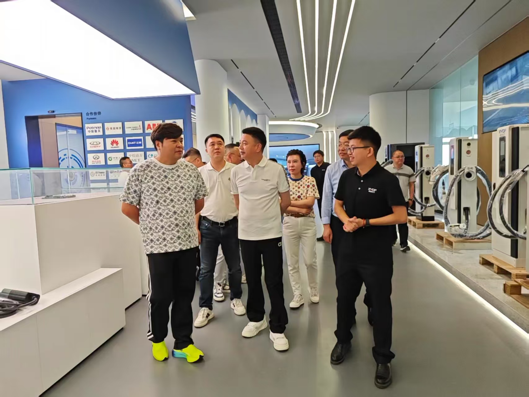 在参观过程中,商会会长一行首先参观了员工办公区域。整洁规范的办公环境、高效有序的工作节奏,展现出企业精细化的管理水平和员工蓬勃向上的精神面貌。随后,众人来到科技展厅,详细了解企业在新能源领域的创新成果。展厅内,从前沿技术研发到核心产品应用,一系列具有自主知识产权的技术成果和解决方案全景式呈现,集中彰显了新亚东方对充电桩行业的深厚技术积淀。